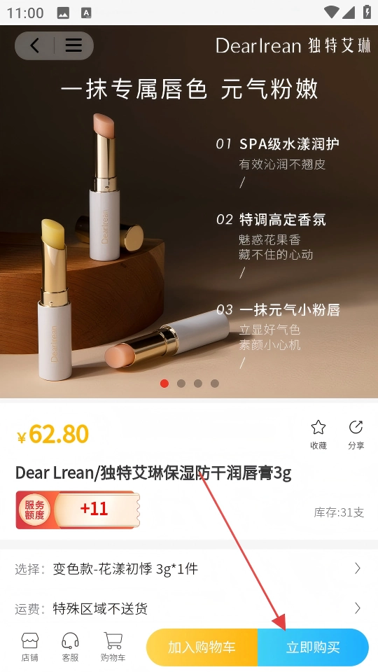 在商品详情页面,浏览完商品信息后,点击【立即购买】按钮,就能开展该美妆商品的购买流程。