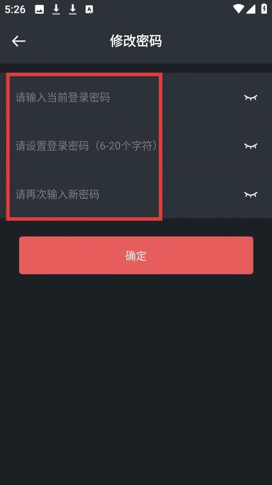 在【修改密码】页面,按顺序填写当前登录密码、新登录密码以及再次确认新密码,之后点击【确定】按钮,就能完成密码修改操作。
