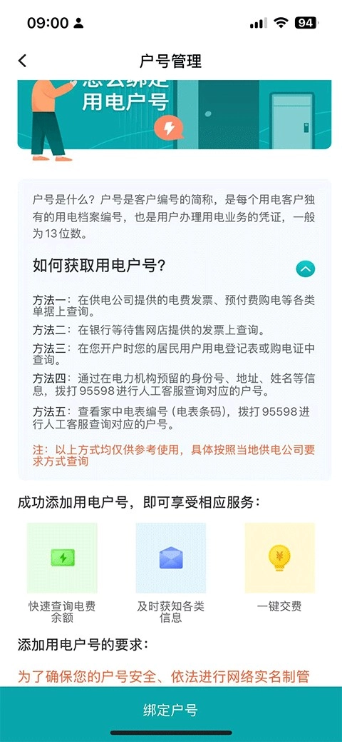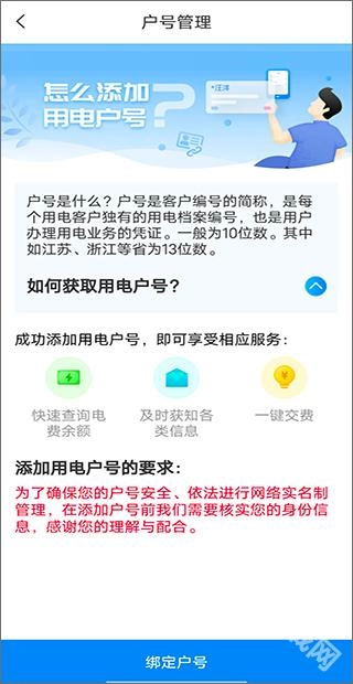 在户号管理页面中,你能看到所有已绑定的户号列表;不过首先得完成户号绑定,获取用电户号的具体方式可参考下图。