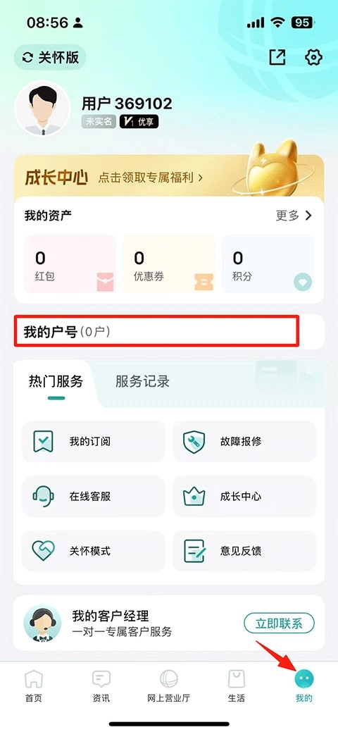 打开网上国网应用,进入“我的”个人中心页面,找到“我的户号”选项并点击它。