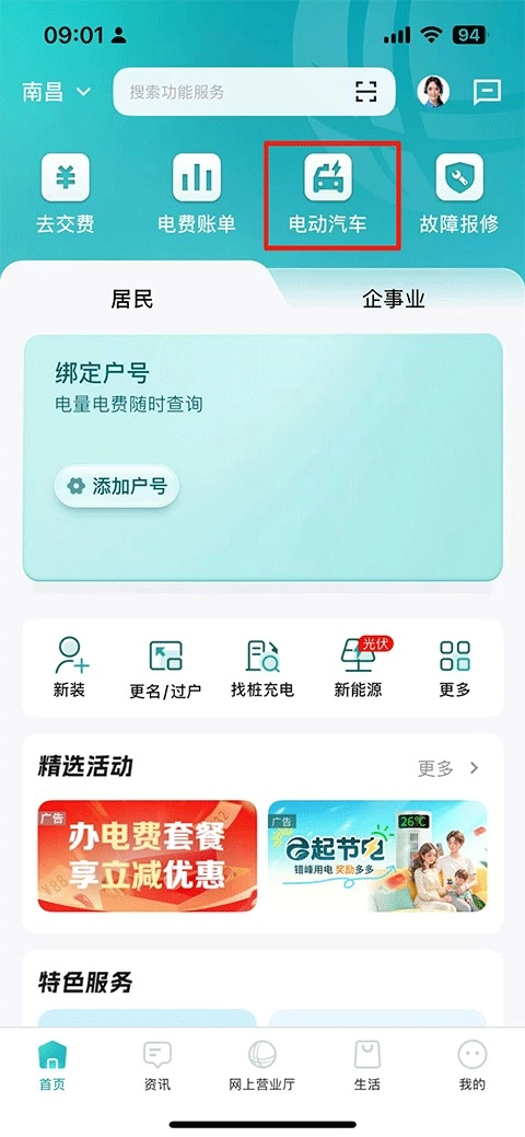 打开国家电网,找到顶部栏的“电动汽车”选项;