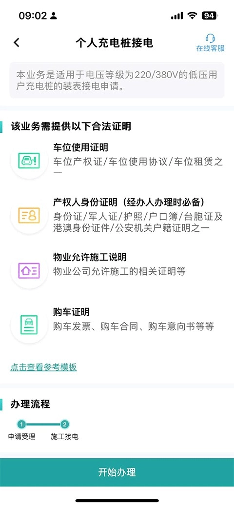 办理该业务需准备车位使用证明、产权身份证明、物业允许施工说明、购车证明等合法材料,确认所有证明均已齐全后,点击下方“开始办理”按钮即可启动流程。