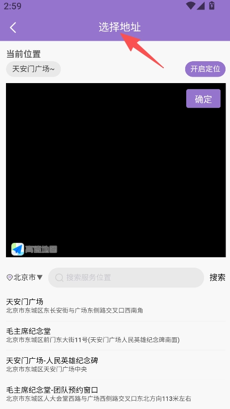 进入地址选择页面,选定服务区域(例如天安门广场)。