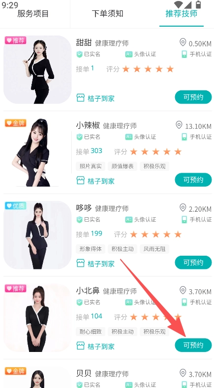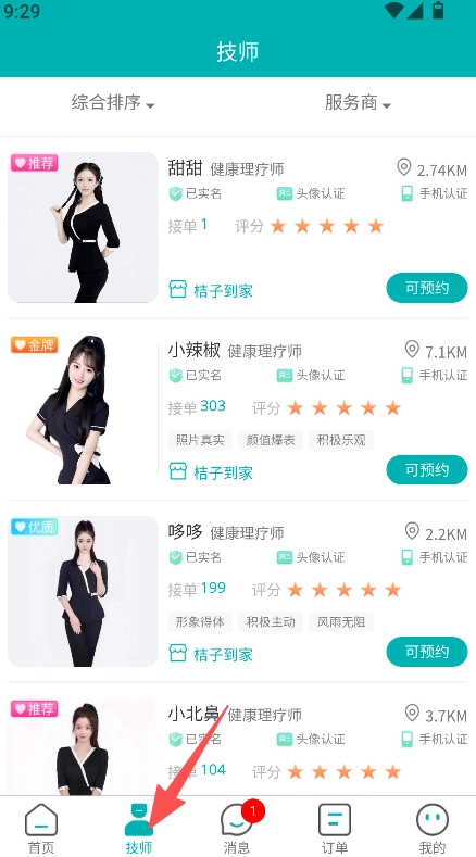 进入技师板块,选择可预约的技师。