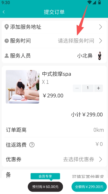 添加服务地址、选择服务时间,提交订单。