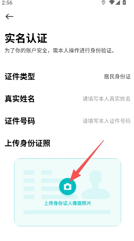 进入实名认证环节,需填写真实姓名与证件号码,并上传身份证人像面的照片。