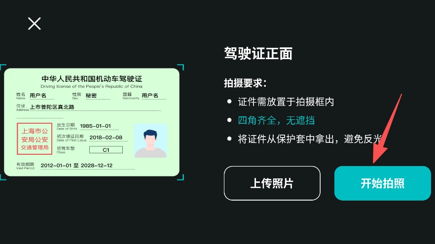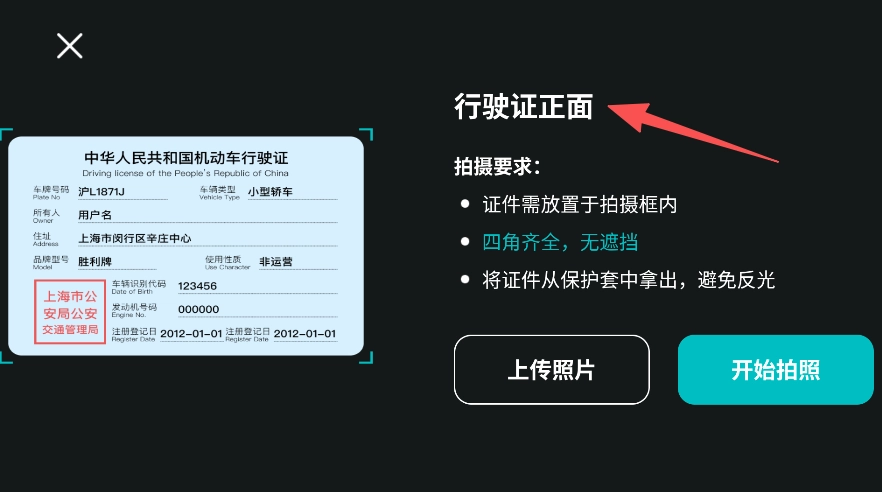 拍摄驾驶证时,请按要求摆放证件,随后进行拍照操作或上传照片。