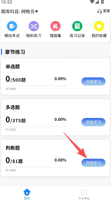 打开软件后,找到章节练习里的判断题部分,点击开始学习。