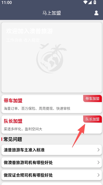 支持加盟模式选择功能,按带车、队长两类加盟形式分类展示,方便用户快速找到对应的加盟方式,让加盟选择过程更高效。