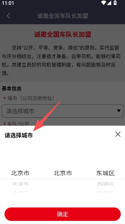 进入加盟页面,选择队长加盟,进入城市选择环节。