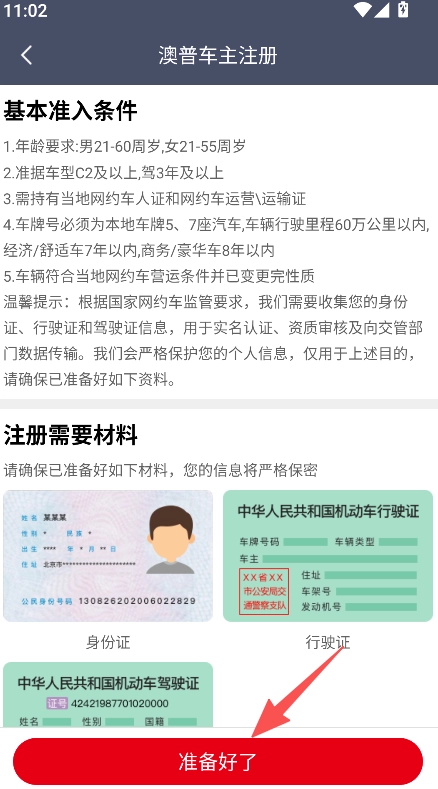 请备好身份证、行驶证、驾驶证等相关材料,随后点击“准备好了”按钮,即可完成注册前的准备工作。