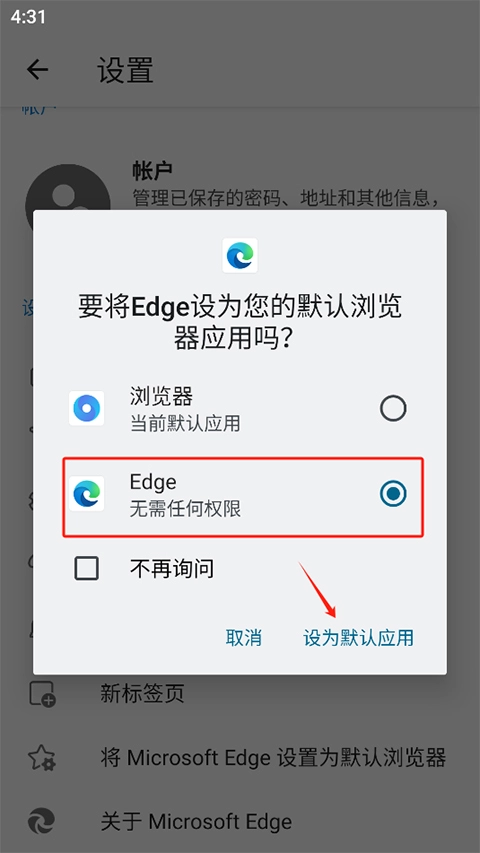 选择将edge设为默认浏览器选项
