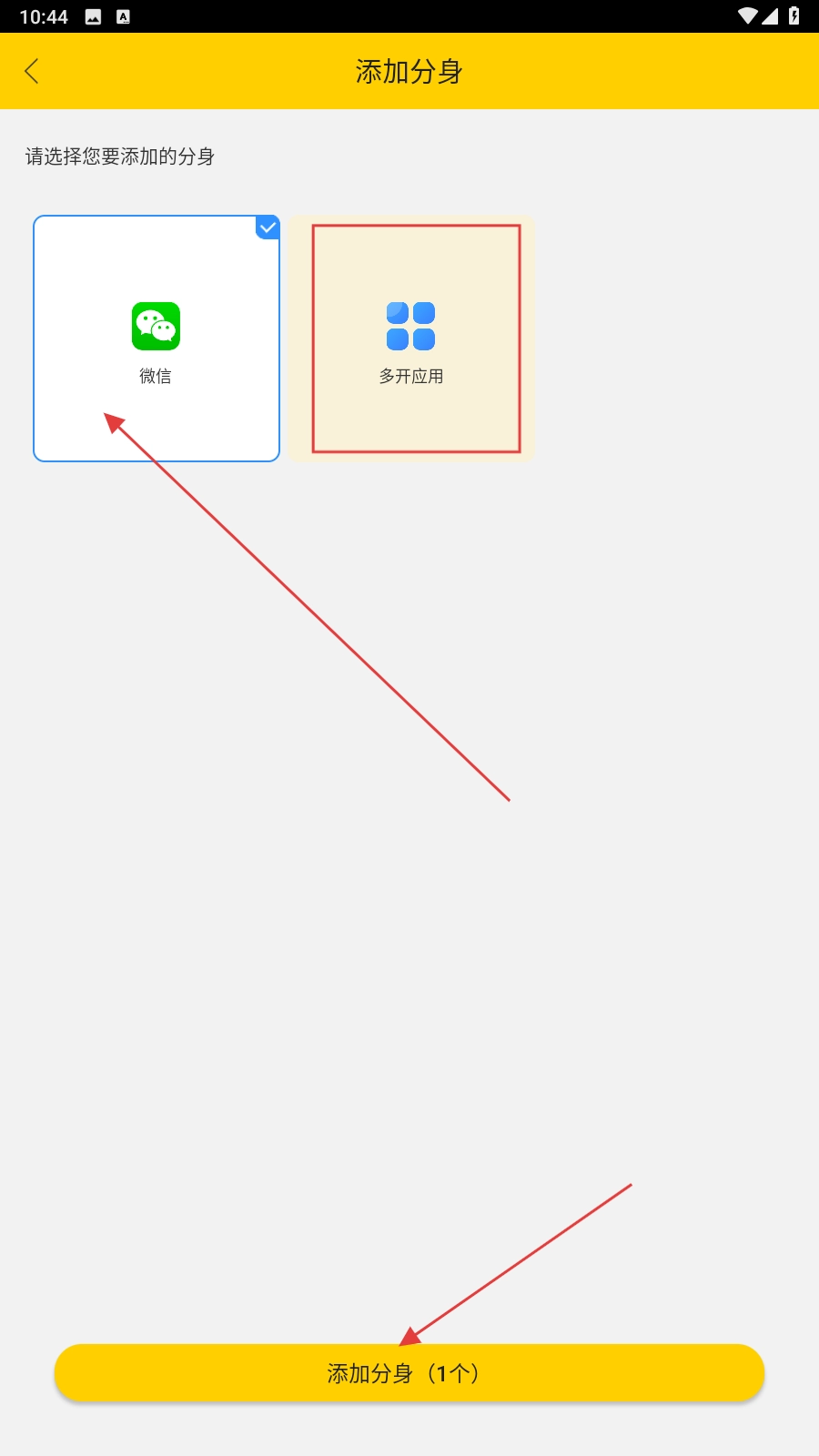 进入添加分身页,选择需要分身的应用(例如【微信】),点击【添加分身】。