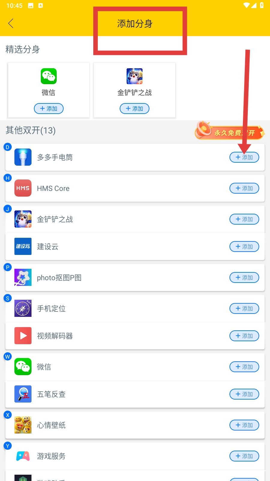 在【添加分身】页面,选择对应的应用(例如多多手电筒),然后点击该应用右侧的【+添加】按钮。