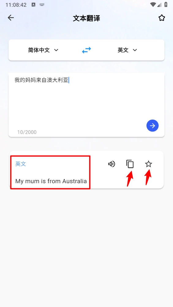 如图所示,点击该入口进入文本翻译界面,输入需要翻译的内容后就能开展翻译操作,系统支持对所需的翻译结果进行复制与收藏。