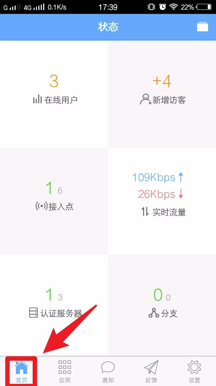 打开应用后会默认停留在首页,在这里可以查看当前在线用户数量、新增访客数量以及实时流量的状态。