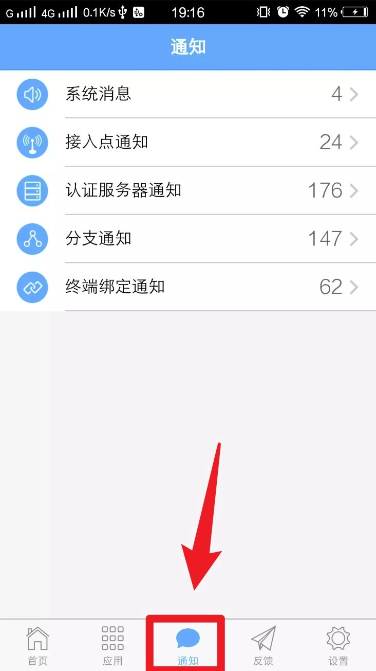 点选底部的通知标签页,就能查看系统信息、接入点通知、认证服务器异常等各类推送提醒。