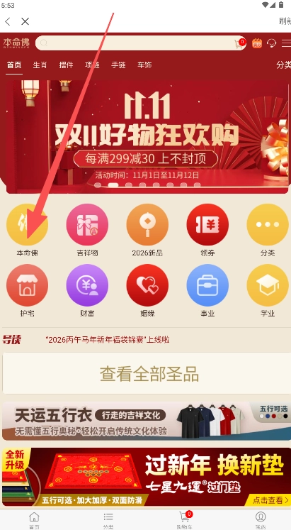 在首页点击“本命佛”图标进入商品分类浏览页。