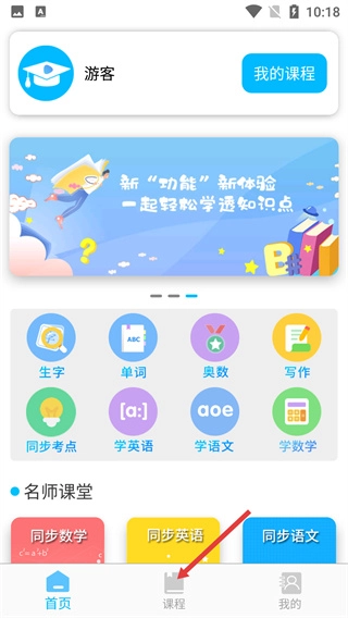 进入首页后,点击底部导航栏中的【课程】按钮,即可进入课程页面,在该页面能够查看名师课程等各类学习内容模块。