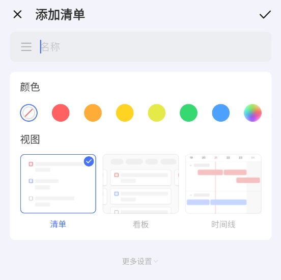 你可以输入想要设置的名称,比如“工作”“学习”“本月”“本周”之类的都可以,另外还能挑选清单的颜色和视图。