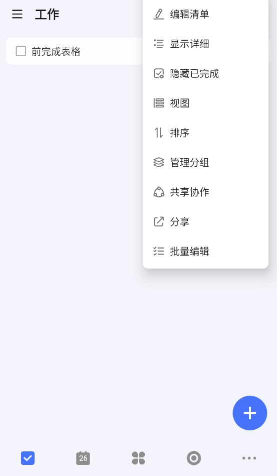 在工作清单页面的右上角,点击三个点的图标就能对清单进行管理,比如设置排序方式、调整详情显示状态,还有管理分组等操作。