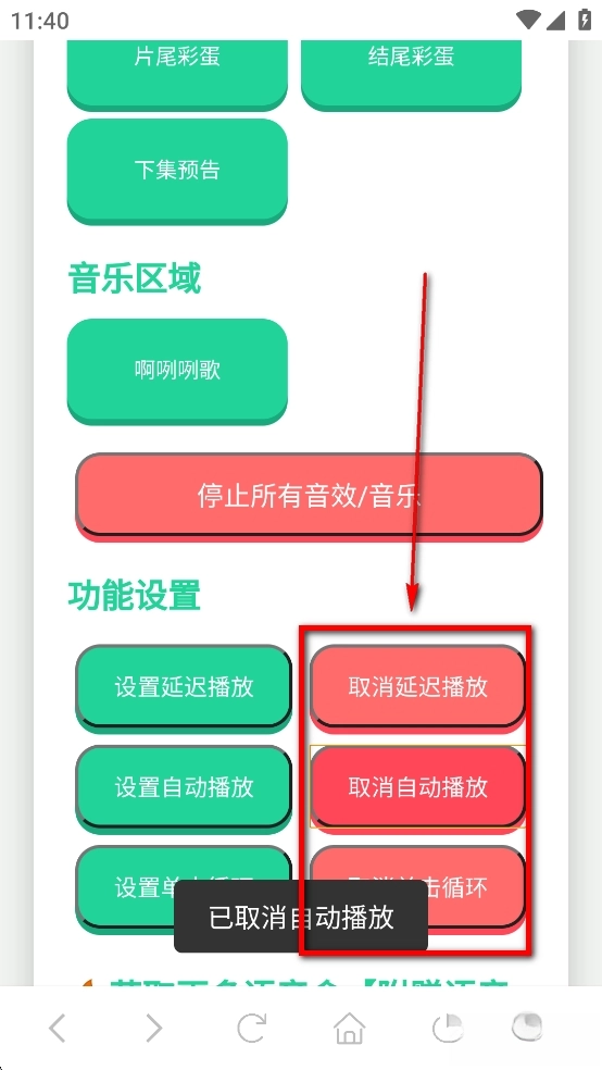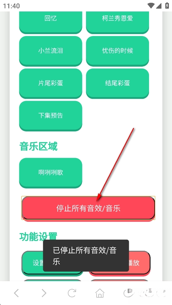 点击“停止所有音效/音乐”按钮,即可暂停当前正在播放的音频。