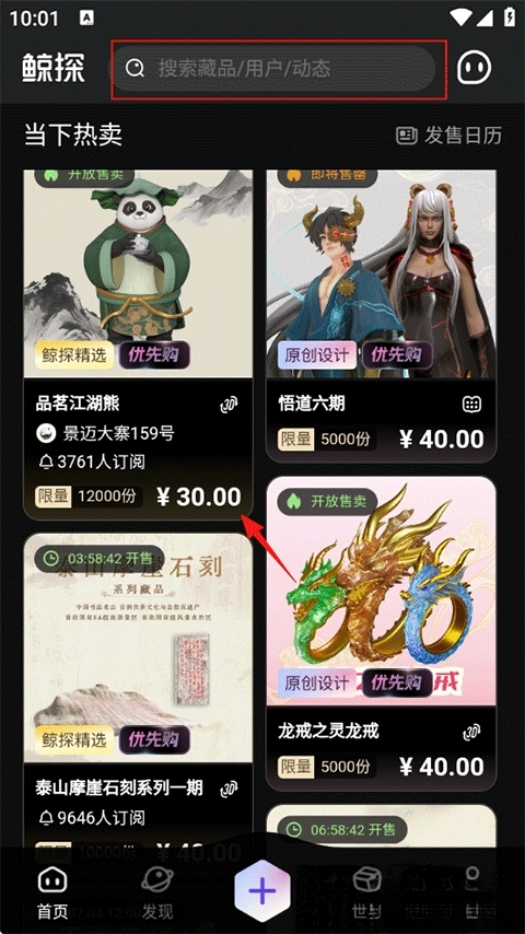 打开鲸探应用,在首页的搜索框中输入你感兴趣的数字藏品名称进行搜索,找到对应的藏品后点击进入其详情页面。
